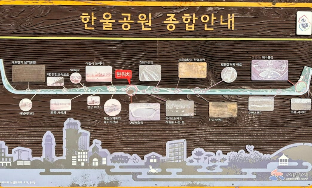 공원은 월곶포구부터 오이도까지 서해안을 따라 약 6km에 걸쳐 조성된 수변 공원이에요.