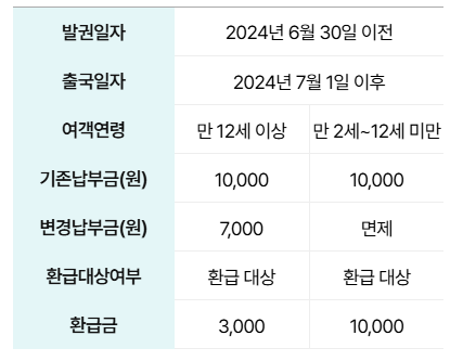 2024년 6월 30일 이전 발권한 여객 중 2024년 7월 1일 이후 출국한 여객이 환급 대상이며, 환급 기준은 아래와 같습니다.