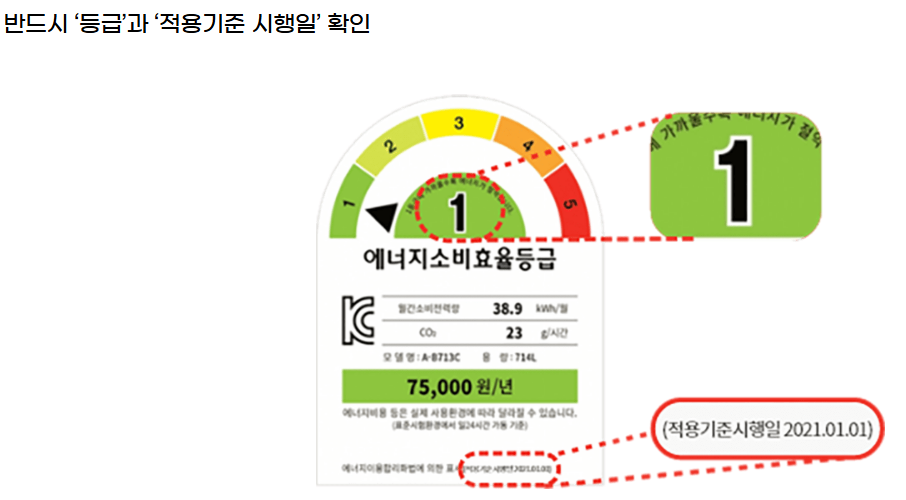 제품 박스나 판매 페이지에서 ‘에너지소비효율등급 1등급’ 마크가 붙어 있는지 꼭 확인해주세요.