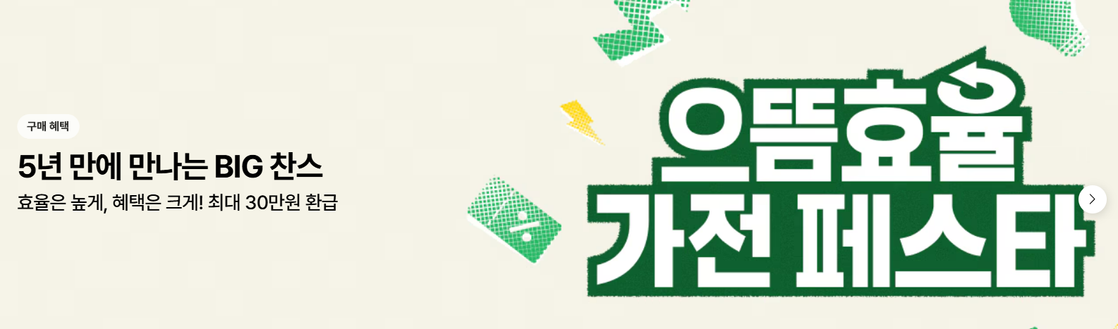 만 19세 이상 대한민국 국민이 TV, 냉장고, 세탁기 등 11개 품목의 최상위 효율 등급 가전제품을 구매할 경우, 구매비용의 10%(개인별 30만원 한도)를 환급해드립니다.