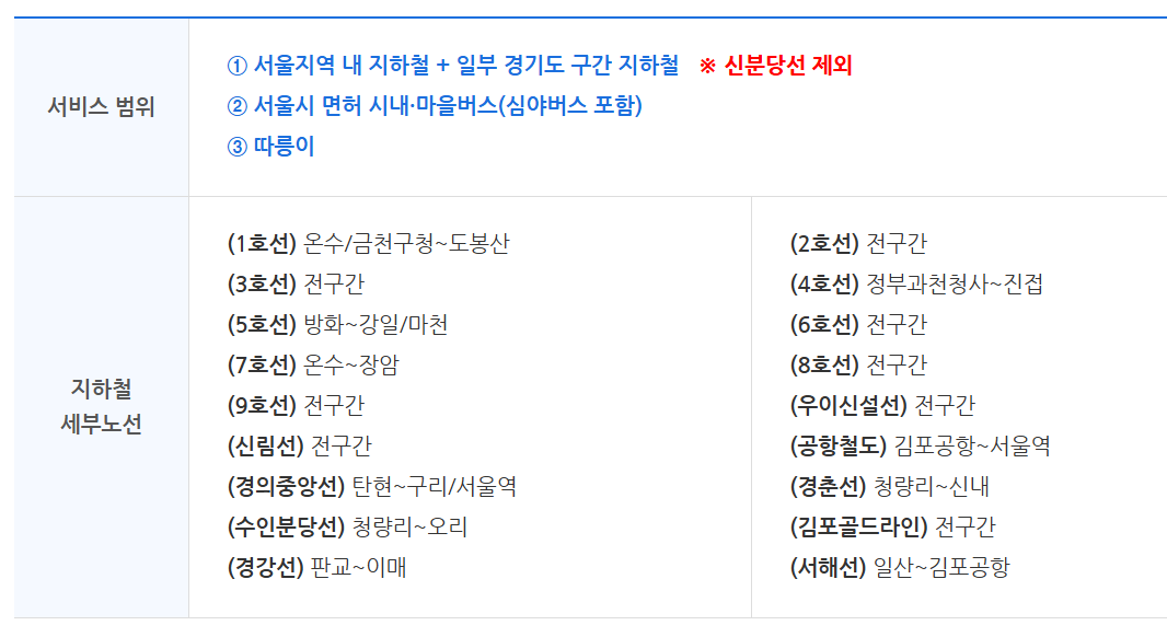 서울지역 내 지하철 및 일부 경기도 구간 지하철에서 이용 가능합니다. 단, 신분당선, 서울지역 외 지하철, 광역/공항버스, 타 지역 면허버스 등은 제외됩니다.